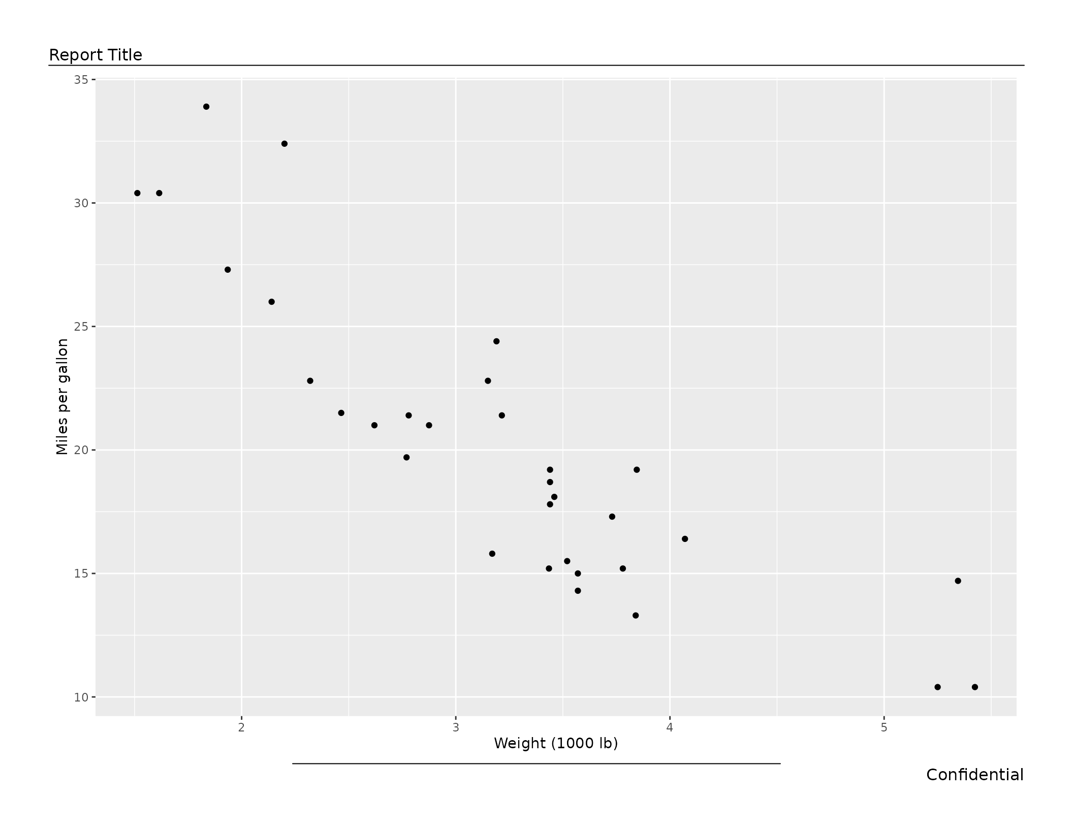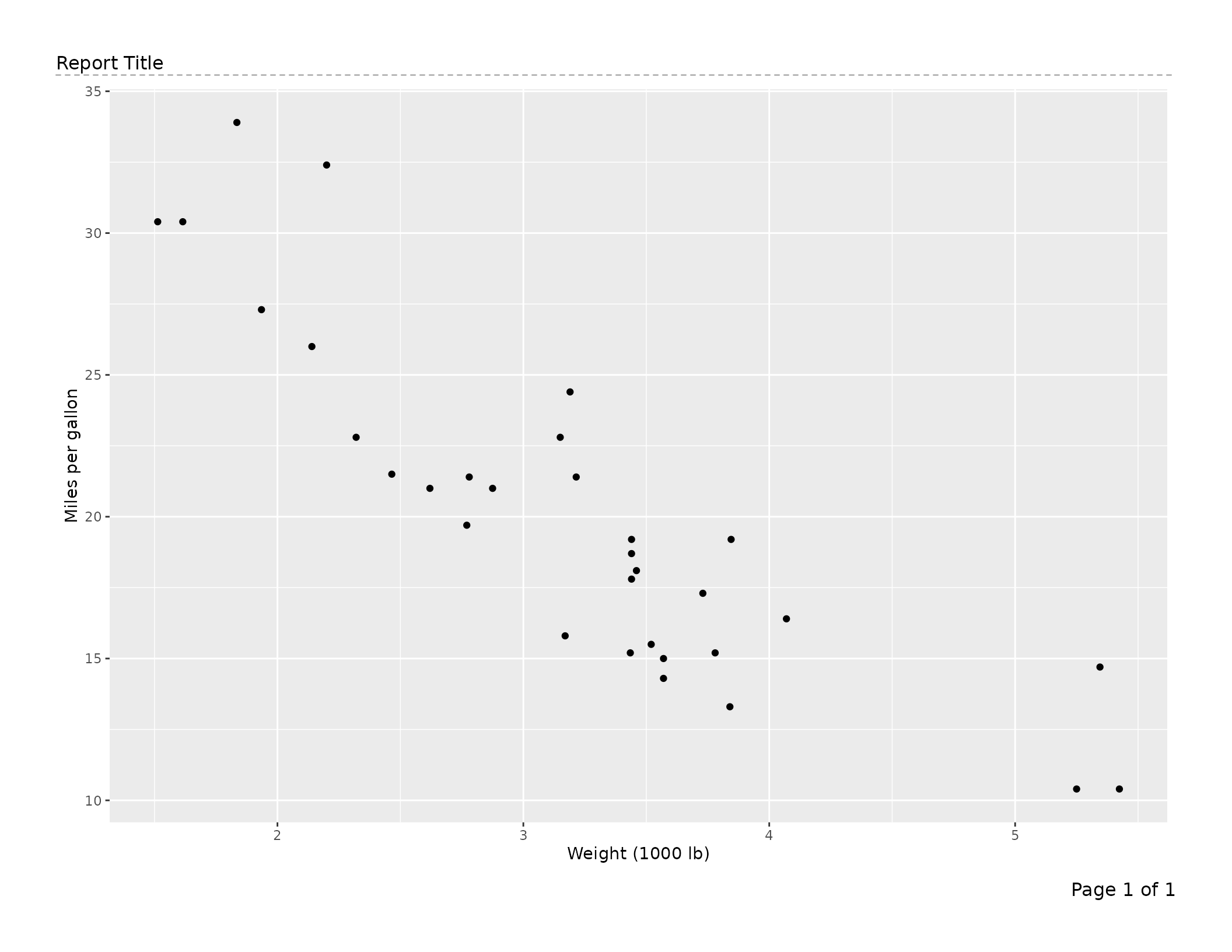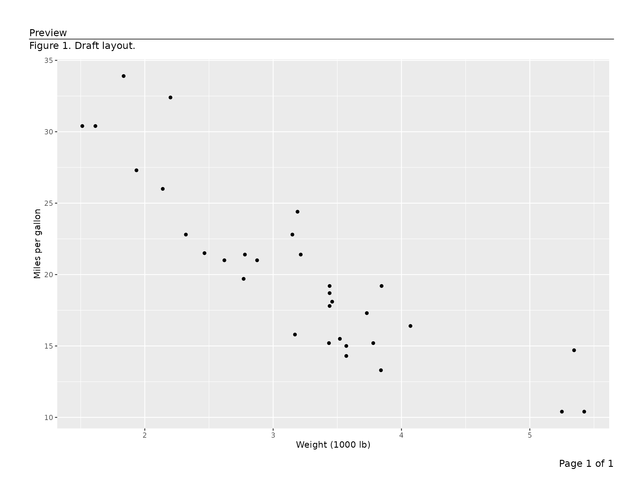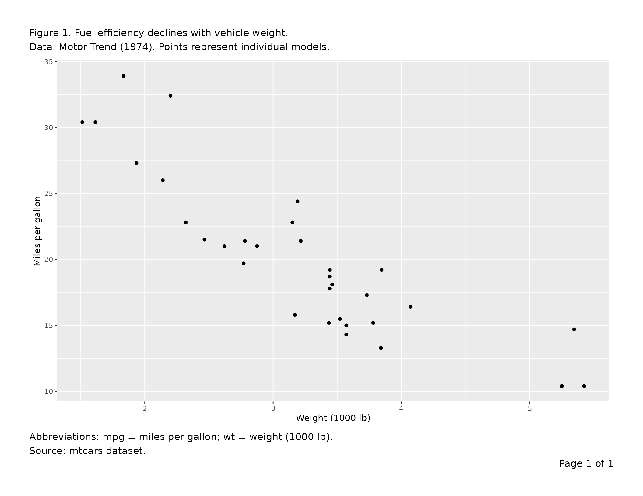 labs(x = "Weight (1000 lb)", y = "Miles per gallon")